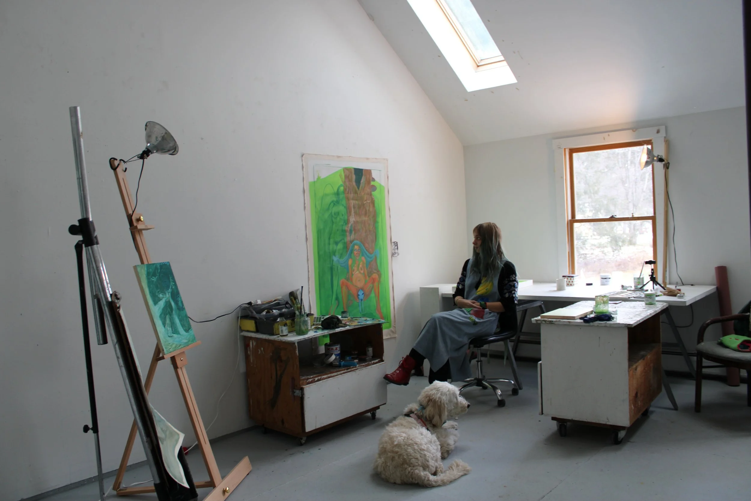 Sky Dai is a disabled, queer, emerging artist living in the Blue Ridge Mountains. Their figurative oil paintings explore imagery from memories, relationships, medicine ceremonies, and the astral realm. Most recently, Sky Dai received a grant to be an artist in residence at Vermont Studio Center in 2024. They received a BFA in fine arts and creative writing at Columbus College of Art and Design and attended and taught School of the Alternative at Black Mountain College. Sky Dai received the Emerging Young Artists Award of Excellence from The Kennedy Center, and they were flown out to Washington D.C. to attend receptions on Capital Hill. Sky Dai also makes hand-painted clothing and one-of-a-kind tarot decks and sells them at a boutique in West Asheville. When they’re not making art, they’re probably reading tarot cards under the moon, searching for a swimming hole, or doing improvisational dance.